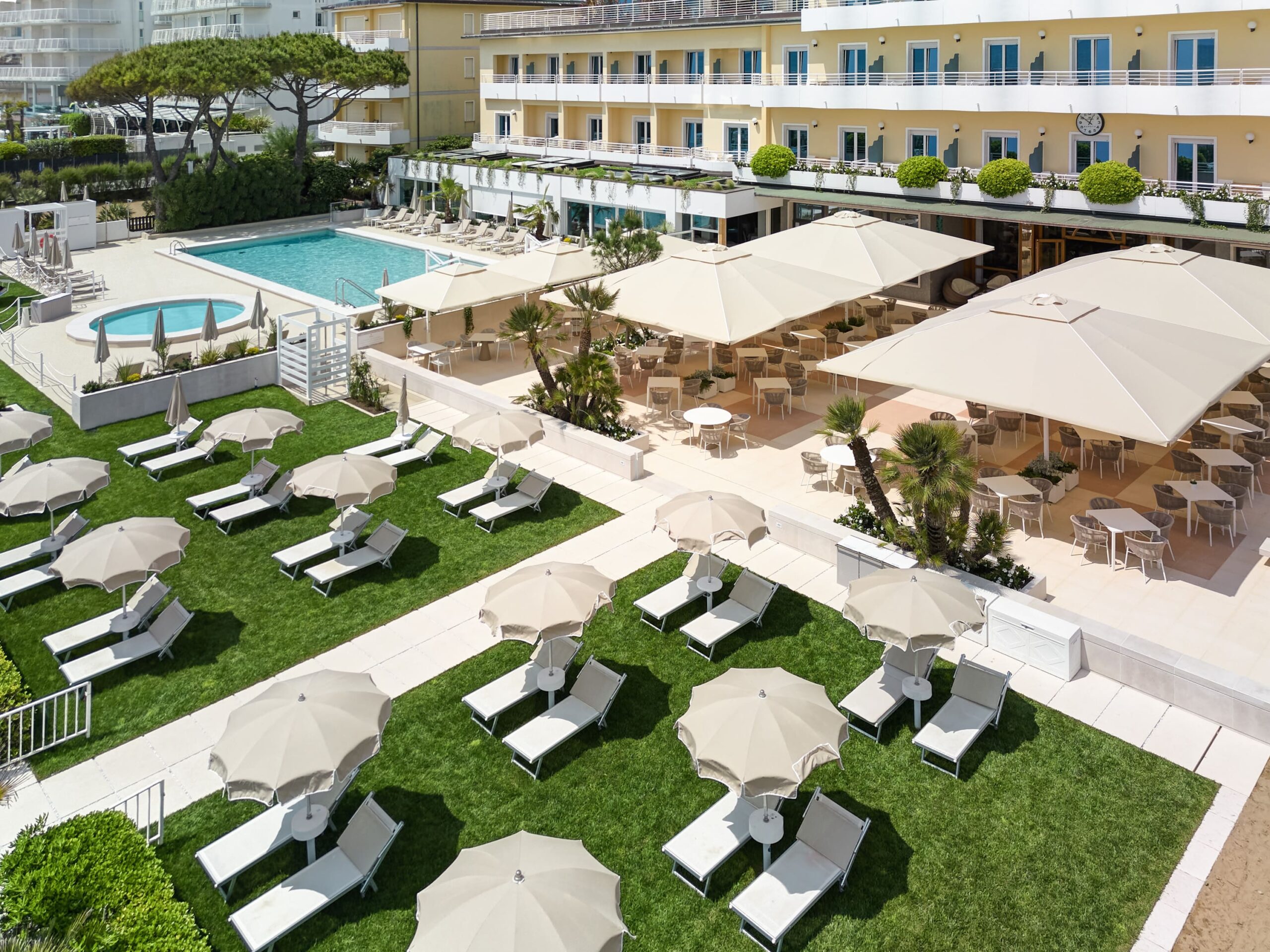 Hotel Aurora è uno degli alberghi storici del Lido di Jesolo. Dal 1928 la sua architettura si è trasformata più volte, mantenendo però sempre un legame profondo con il contesto unico che lo accoglie. La hall si configura come un vero e proprio cannocchiale visivo che connette Piazza Aurora al mare, mentre la terrazza esterna diventa un naturale elemento di dialogo con l’orizzonte.