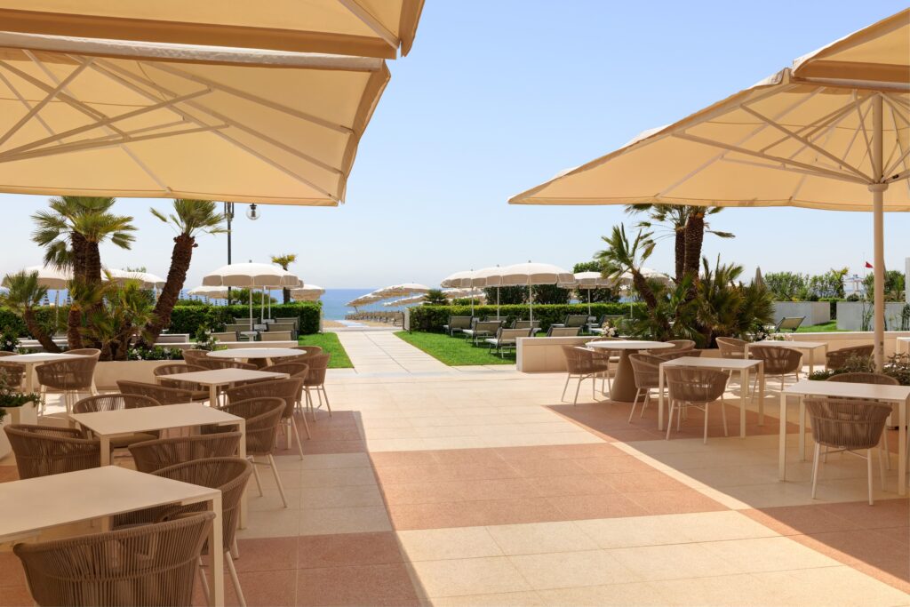 L’ampliamento della sala ristorante si distingue per un volume con giardino pensile e dodici ampi lucernari, che inondano lo spazio di luce zenitale trasformandolo in una soglia sospesa tra interno ed esterno. La terrazza, invece, riprende il dialogo con la tradizione grazie a una pavimentazione in granigliato dai colori originari, arricchita da rivestimenti in marmo massello, dove materia ed estetica si fondono in un equilibrio senza tempo.