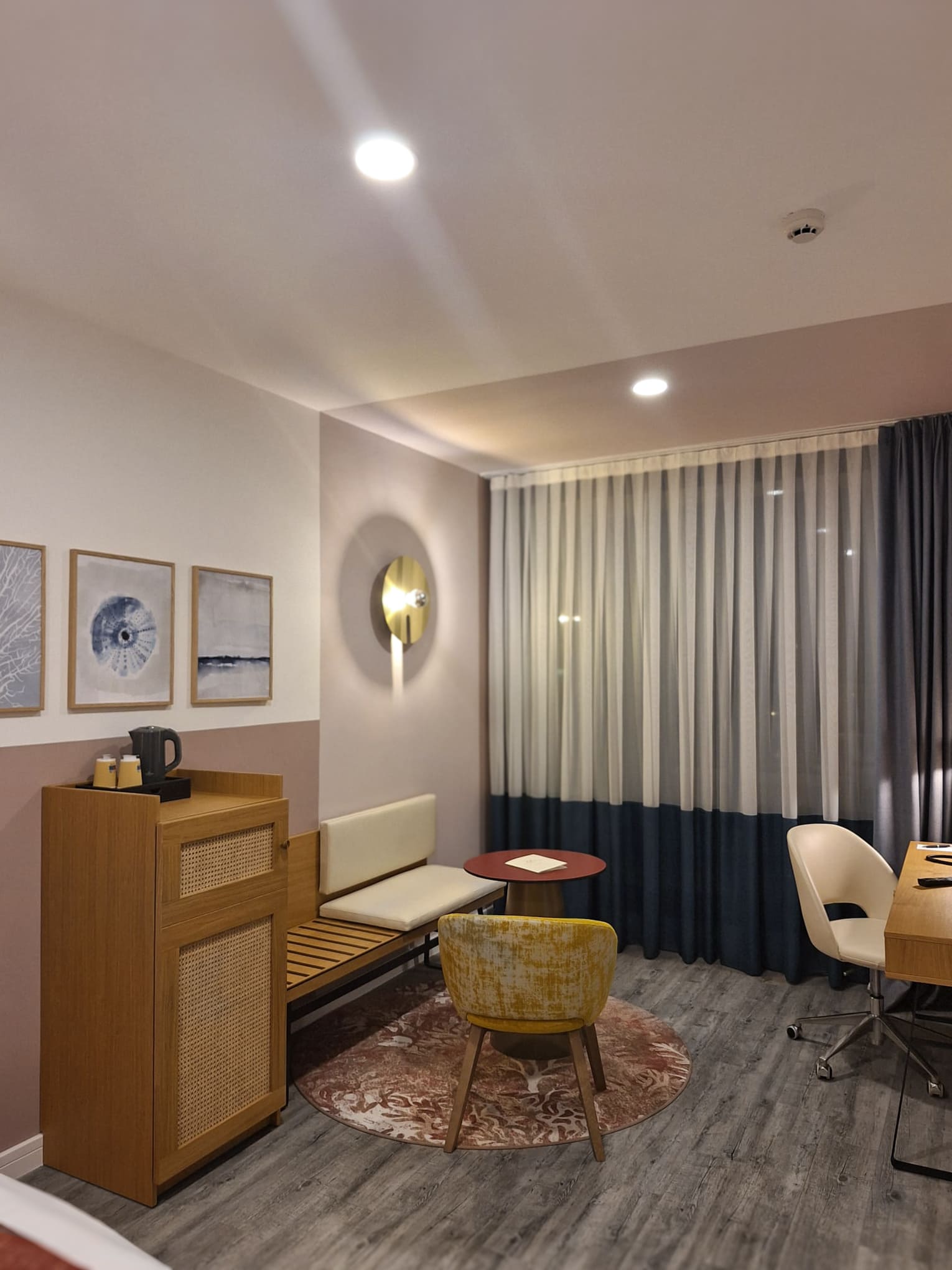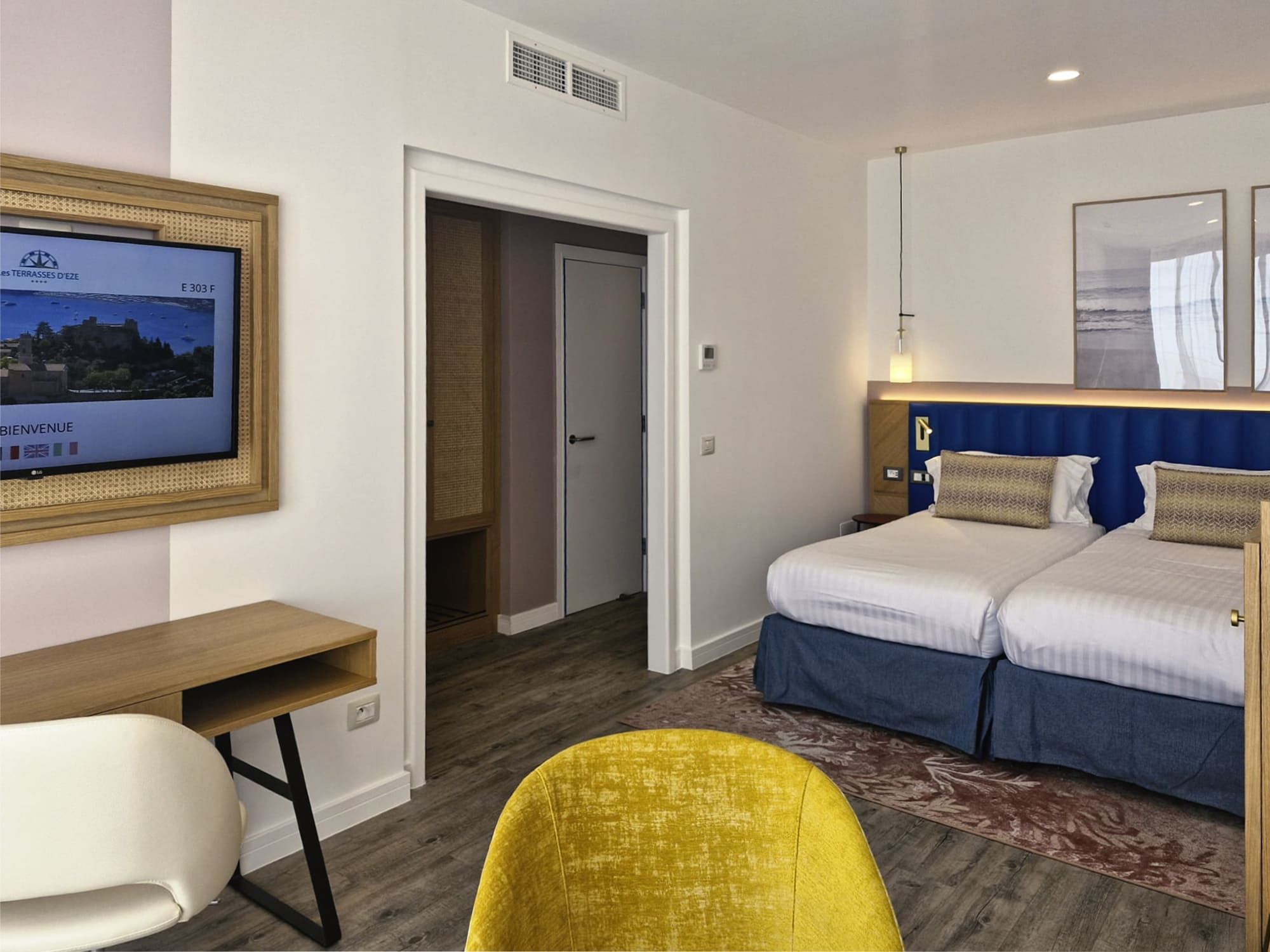 Il progetto delle camere nasce con l’intento di creare un rifugio di quiete sulla Costa Azzurra, un angolo intimo che racconta il Mediterraneo attraverso materiali e colori scelti con cura: la leggerezza della paglia di Vienna, la solidità del metallo, il calore autentico del legno naturale. Le sfumature dell’azzurro, del corallo e del giallo richiamano il mare all’orizzonte, la sabbia dorata e i tramonti d’estate.