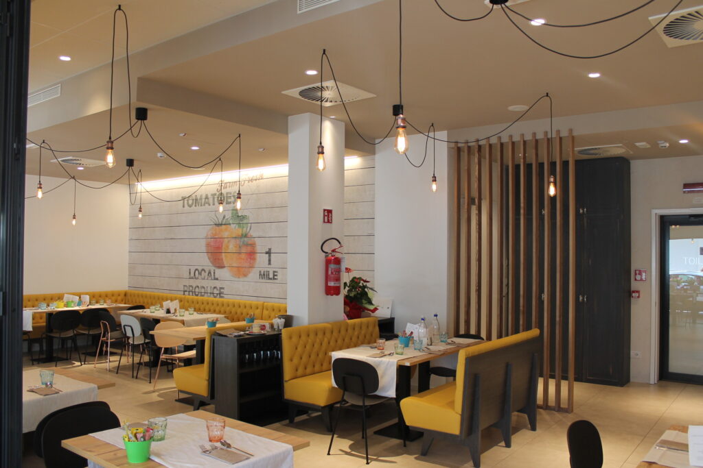 Le panche capitonné in un brillante giallo senape diventano protagoniste dello spazio: eleganti e al tempo stesso frizzanti, donano carattere all’ambiente e stimolano convivialità, richiamando psicologicamente l’appetito. I tavoli in legno chiaro e le sedute dal design semplice completano un’atmosfera informale e accogliente.