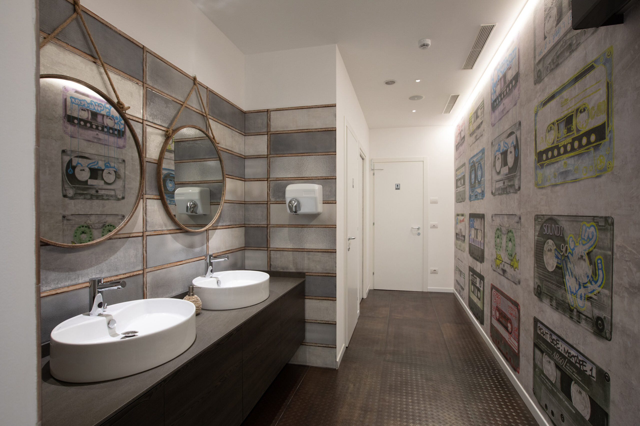 Dettagli grafici, come la grande illustrazione murale dei pomodori e la parete pop dei bagni decorata con cassette musicali, aggiungono un tocco ironico e giocoso, rafforzando l’identità giovane e contemporanea del locale.
