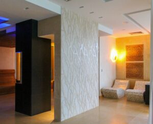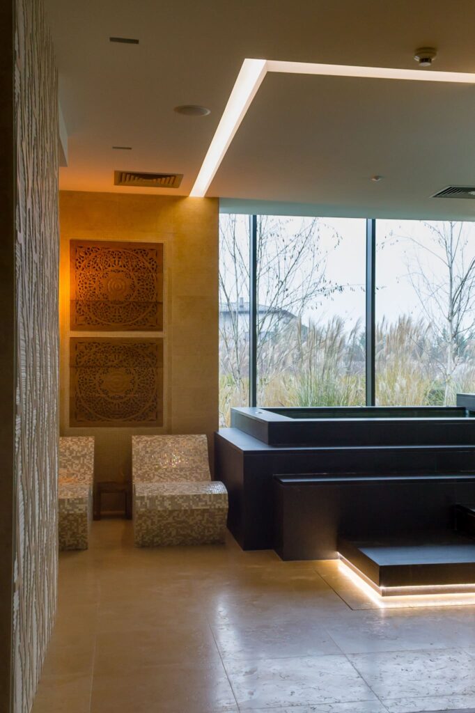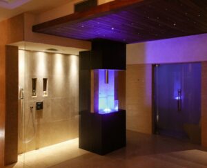 Questa SPA si distingue per un design che unisce la purezza dei materiali naturali a un sapiente gioco di luce e riflessi. Marmi intarsiati e inserti in legno dialogano con superfici morbide e dettagli geometrici, creando contrasti raffinati che esaltano la matericità degli spazi. L’illuminazione diventa protagonista: segna i volumi, disegna le texture e genera atmosfere intime e suggestive. Il soffitto in vetro che sovrasta la vasca di reazione dona un’impressione di leggerezza sospesa, come se l’acqua stessa si librasse nello spazio. Ogni ambiente è pensato come un invito a rallentare, a ritrovare equilibrio e benessere in un contesto che unisce eleganza contemporanea e suggestioni naturali.